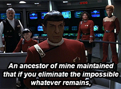 In Star Trek XI, Spock declares, “An ancestor of mine maintained that if you eliminate the impossible, whatever remains – however improbable – must be the truth.” This is, of course, a Sherlock Holmes quote. The implied meaning is that Spock’s human half traces its ancestry to Sherlock Holmes. Or what if Sherlock was really a Vulcan? An alien, that is … where’s Agent Fox Sherlock?