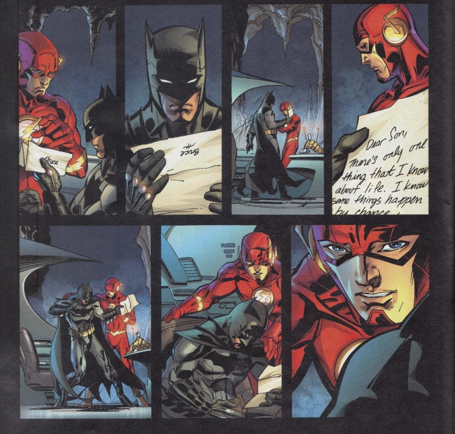 Thomas Wayne ultimately sacrifices himself to restore reality. Before he does, Thomas Wayne drafts this letter to Bruce and compels The Flash to deliver this letter to Bruce, who still lives in the original universe.